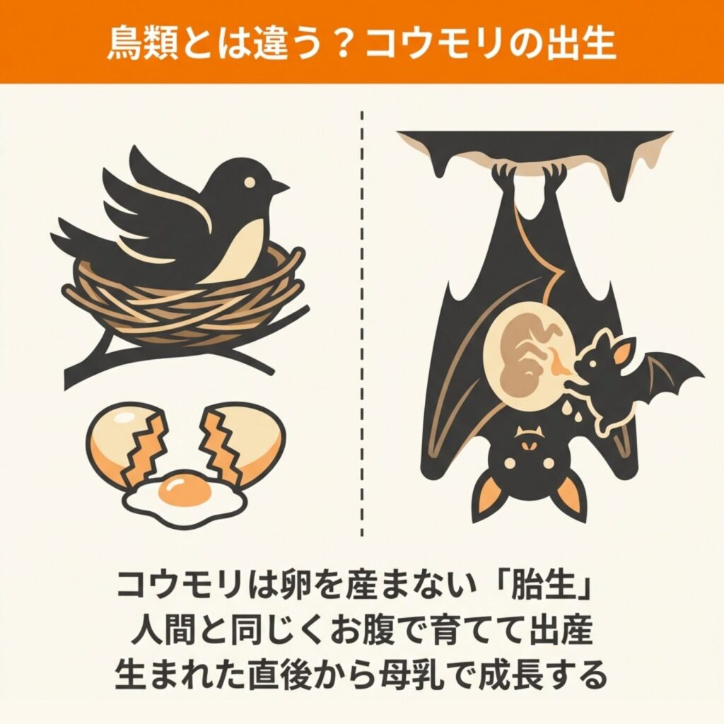 鳥類は卵を産んで孵化させる「卵生」ですが、コウモリは母親のお腹の中で胎児を育てて出産する「胎生」に該当します。