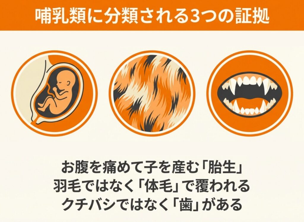 卵ではなく赤ちゃんを産む「胎生」で、体毛で覆われ、歯が生えているなど哺乳類の特徴をすべて備えています。