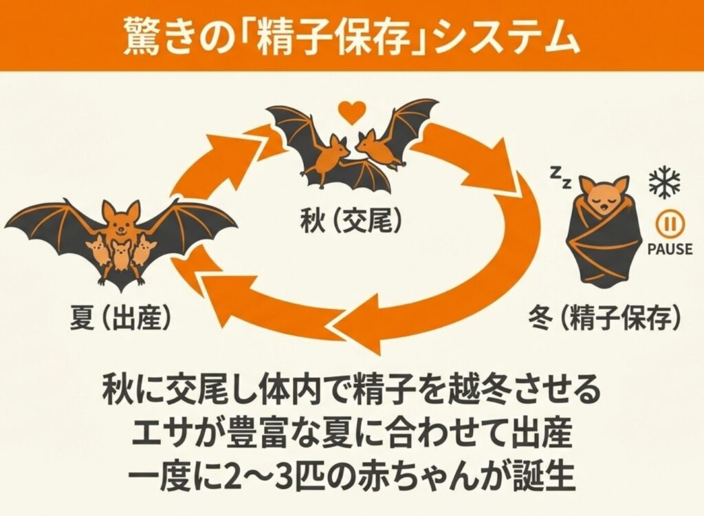 厳しい冬を乗り越えながら子孫を残すために身につけた、コウモリならではの繁殖戦略といえます。