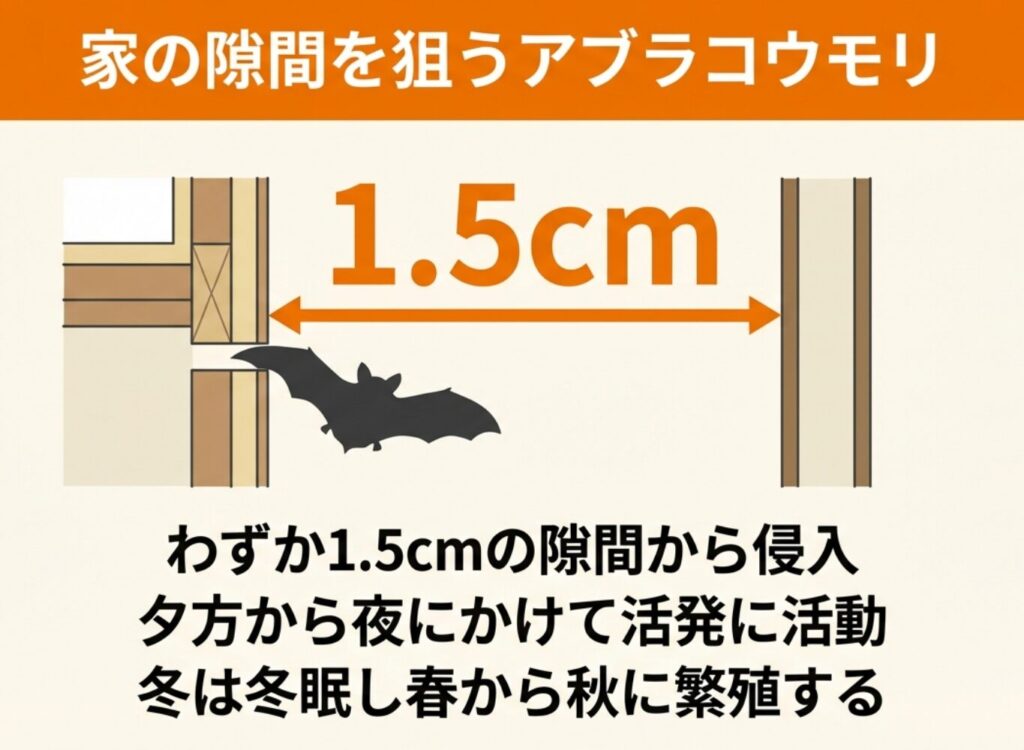 アブラコウモリは1.5cm程度の隙間でも入り込めるため、すべての隙間を完全に塞ぐのは簡単ではありません。