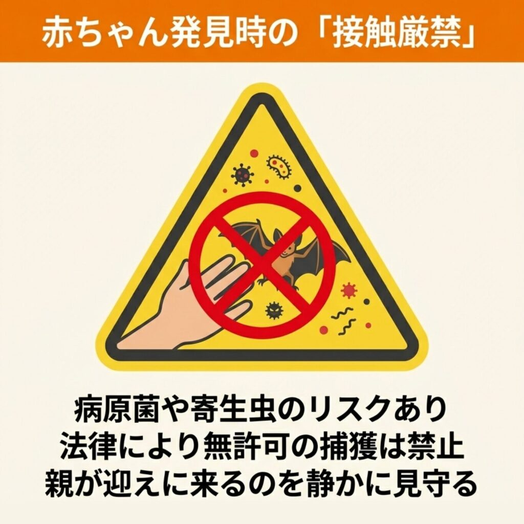 コウモリの赤ちゃんを見つけても、すぐに手を出さず、まずは様子を見るのが基本です。
