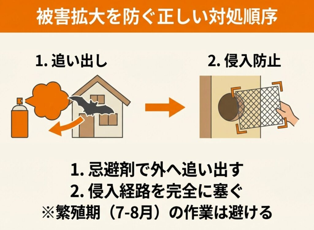 コウモリは法律で保護されているため、捕獲や殺傷はできず、追い出しと侵入防止が基本的な対処法です。