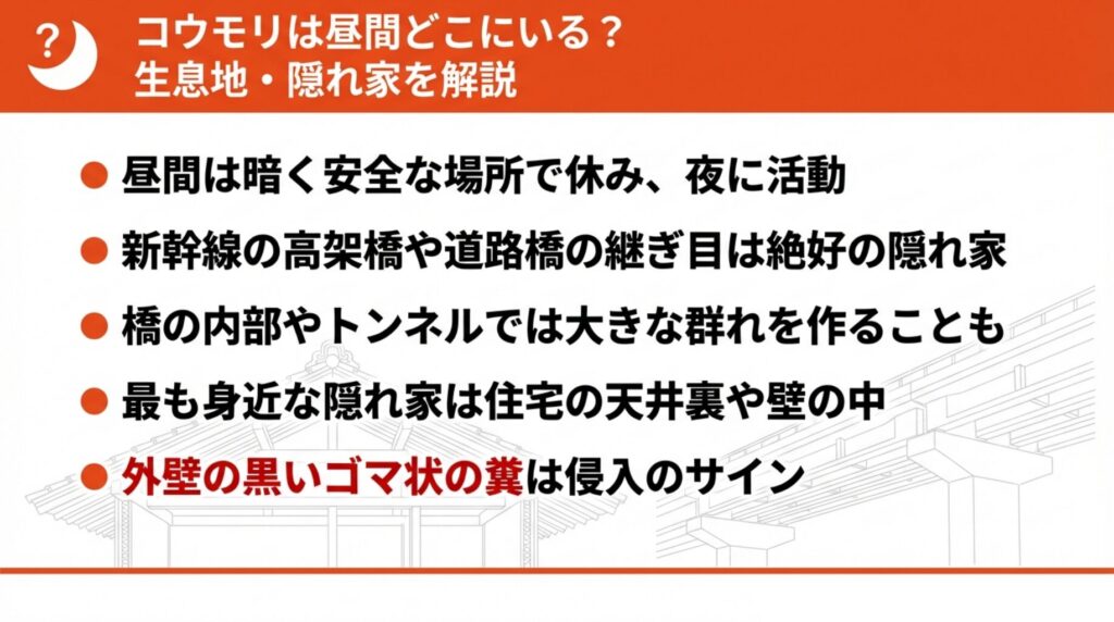 コウモリは昼間、私たちが気づかない身近な場所で静かに休んでおり、新幹線の高架橋や住宅の天井裏、外壁の隙間などを巧みに利用しています。