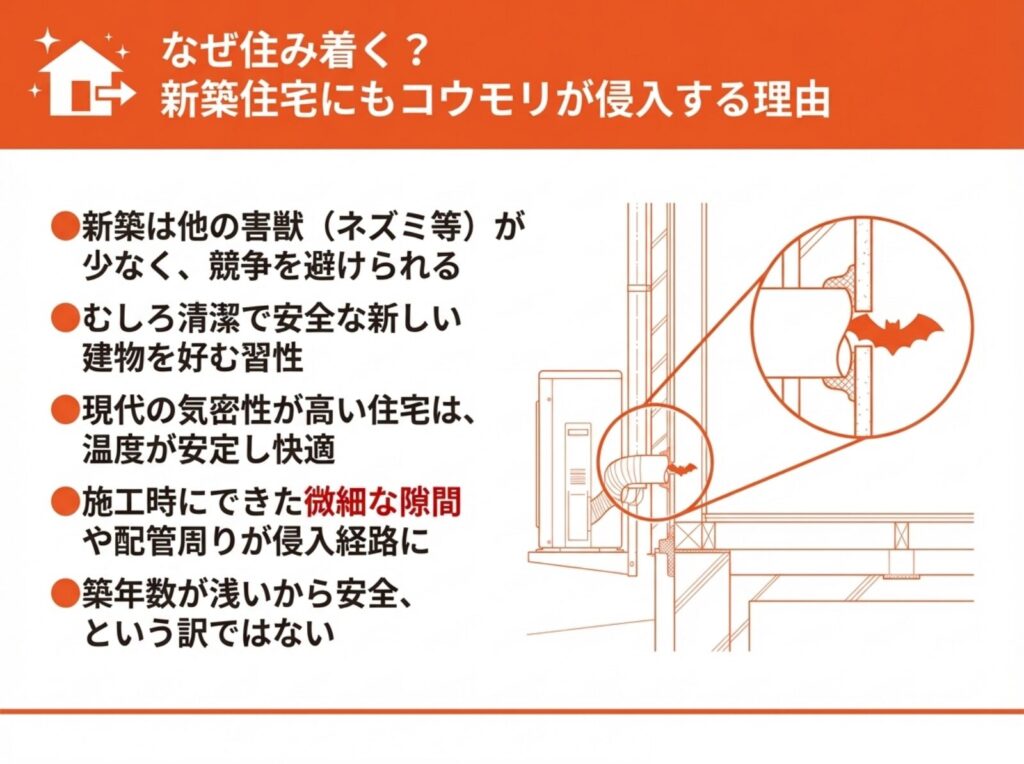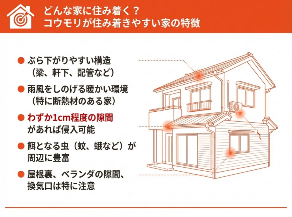住み着きやすい家の特徴として、ぶら下がりやすい構造、雨風をしのげる環境、わずか1センチの侵入可能な隙間、豊富な餌場という4つの条件が揃っていることが重要であり、新築住宅でも例外ではありません。