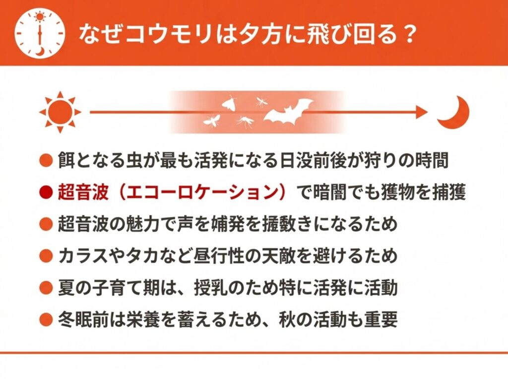 夕方に飛び回る行動は、虫の活動時間に合わせた効率的な狩りであり、超音波による精密な獲物探しと天敵回避という生態的な理由に基づいています。