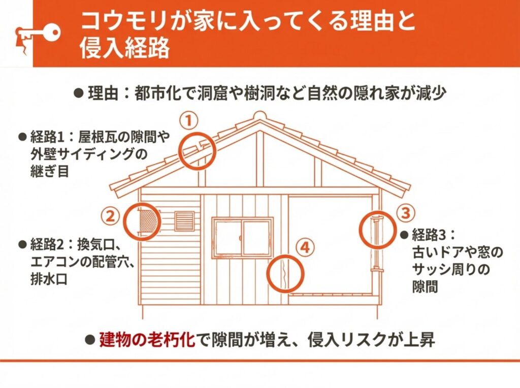 建物が古くなると隙間が増えるため、コウモリが入り込みやすい状態になっていきます。