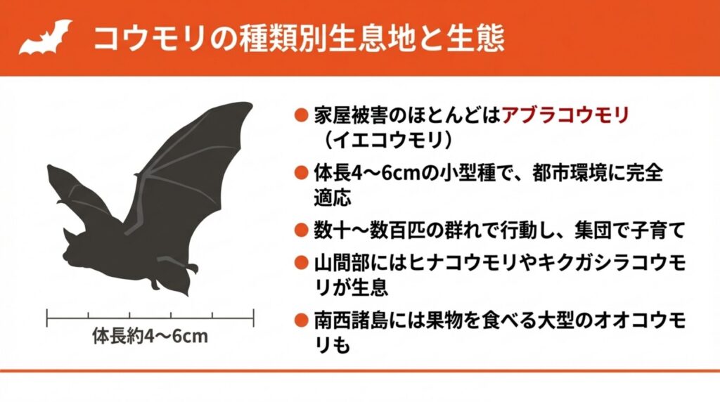 本州では標高や緯度によって種類の構成が変わり、平野部ではアブラコウモリが多い一方、山間部ではヒナコウモリやキクガシラコウモリが主な種類となります。