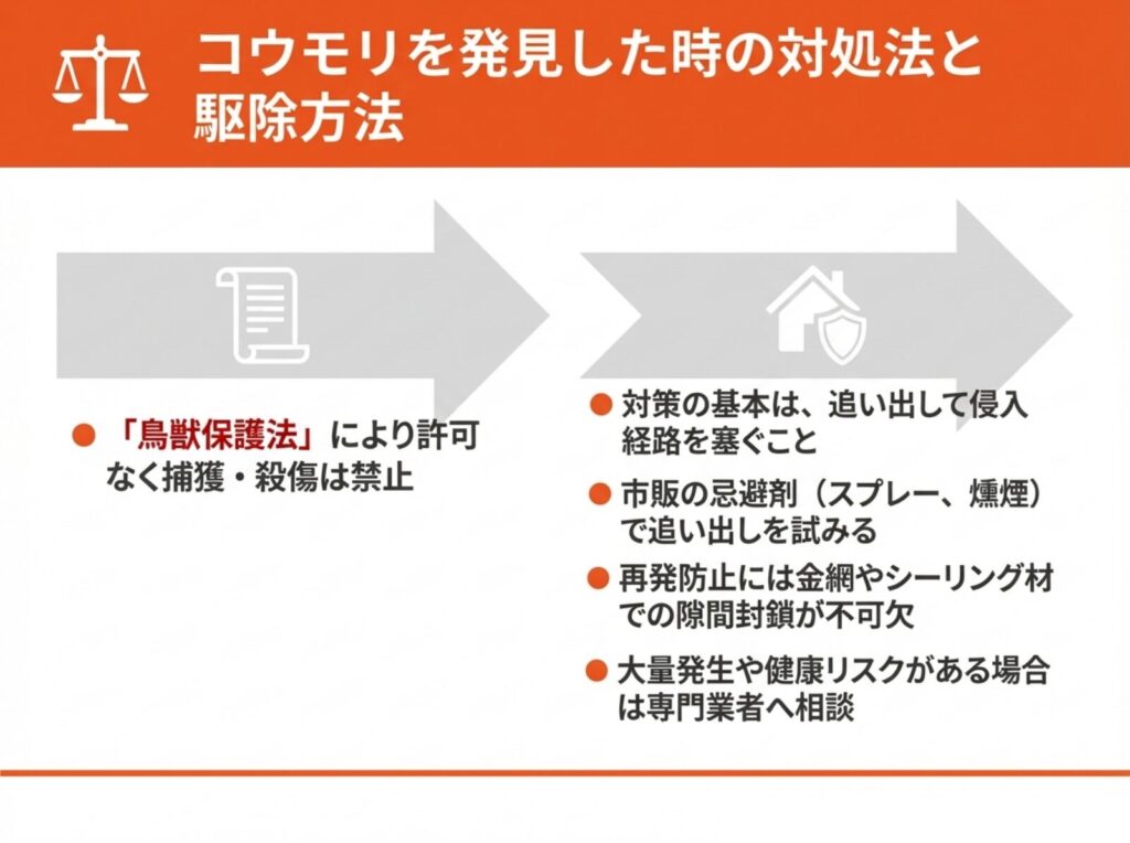 鳥獣保護法により、コウモリの捕獲や殺傷は禁止されているため、追い出しと侵入防止が対策の基本になります。