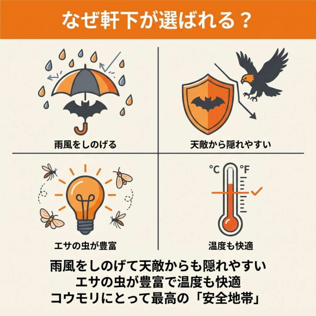 ここでは、コウモリが軒下を選ぶ5つの理由を見ていきましょう。