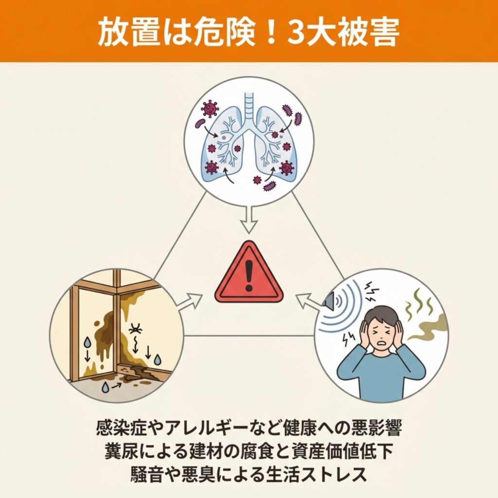 ここでは、コウモリを放置した場合に起こる被害を詳しく解説します。