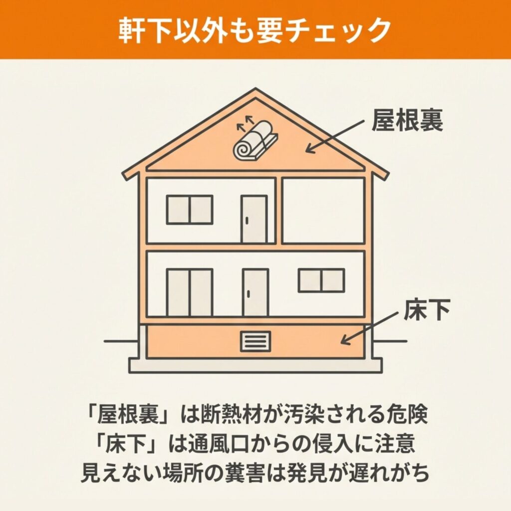 一度子育てに成功した場所には、翌年も戻ってくる習性があるため、放置すると被害が長期化します。