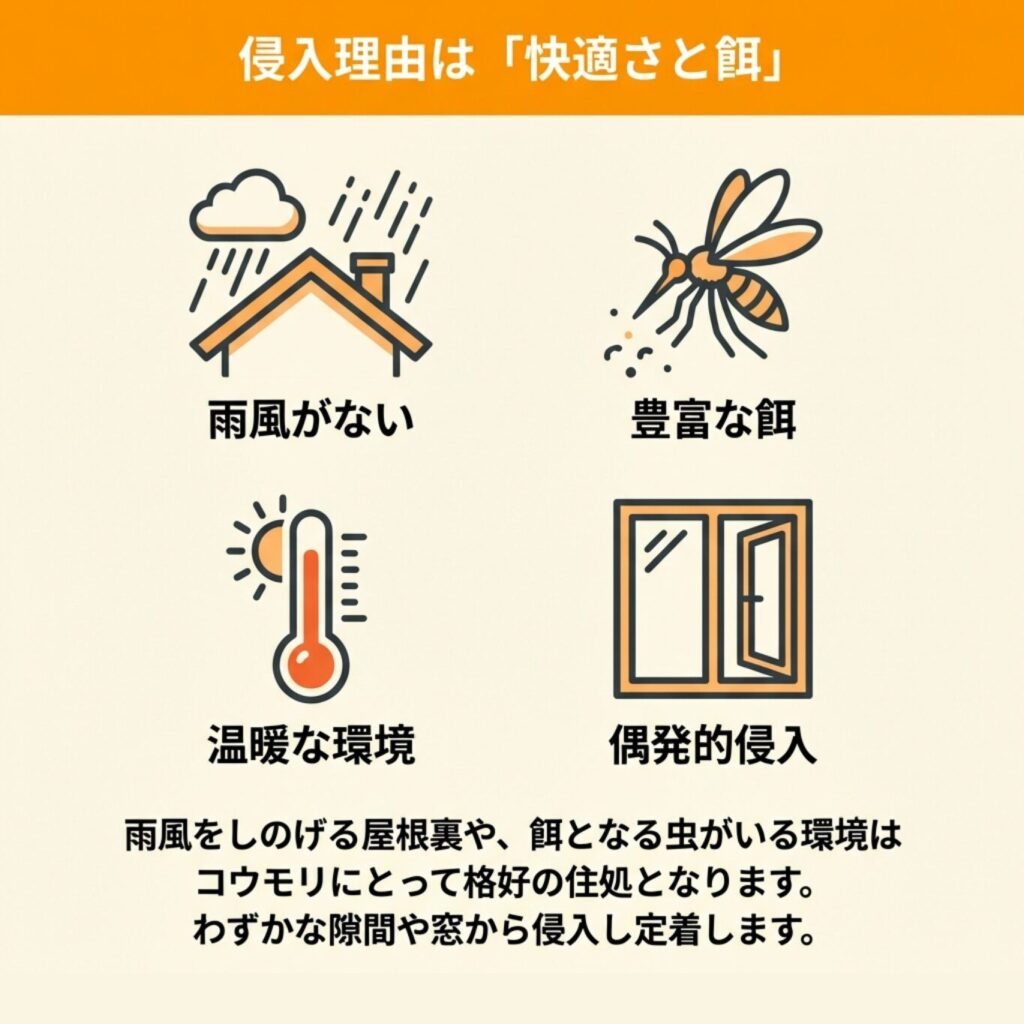 まずは、コウモリが家に入ってくる主な理由を4つの観点から見ていきましょう。
