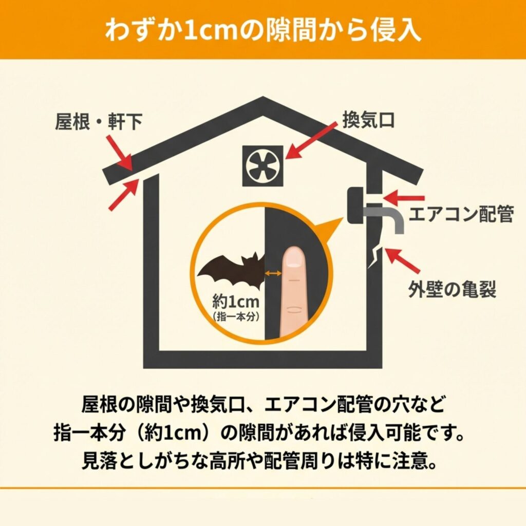 人間の目にはほとんど気にならないような小さな隙間でも、コウモリにとっては十分な入口となります。