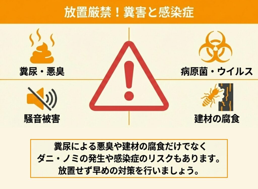 コウモリ被害を放置すると、糞尿による家屋の損傷、深刻な健康被害、騒音による生活の質の低下など、多岐にわたる問題が発生するため、早期の対応が求められるでしょう。