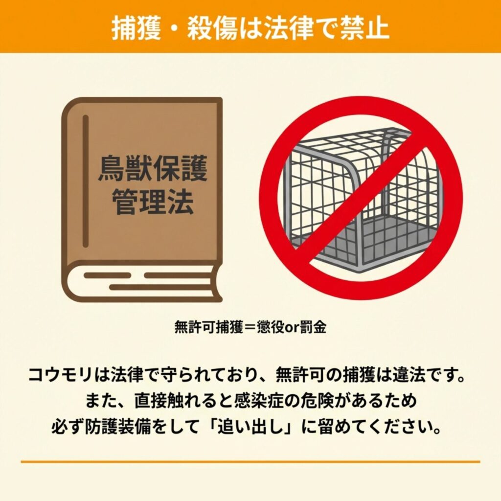 鳥獣保護管理法で禁止されているのは「捕獲」と「殺傷」であり、忌避スプレーや燻煙剤を使った追い出しは法律違反になりません。