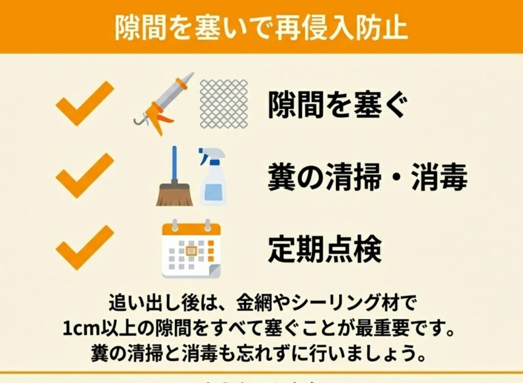 対策としては、場所に応じた追い出し方法を実施し、その後に侵入口を確実に封鎖することが重要となります。