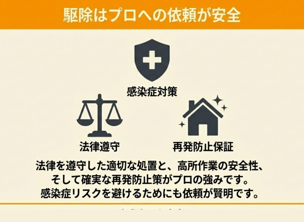 専門業者に依頼することで、感染症リスクから身を守りながら安全に駆除を完了できます。