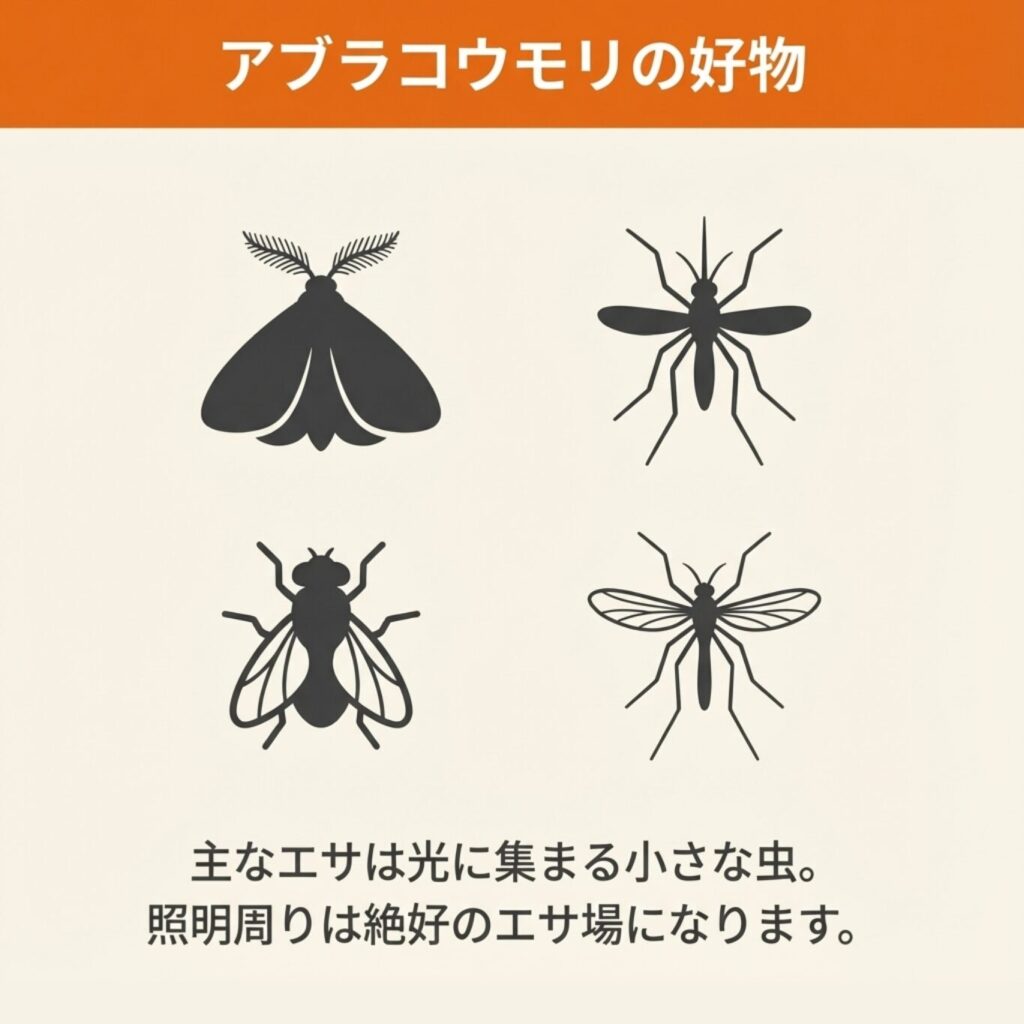アブラコウモリの主なエサは、ハエ、ガ、蚊、ユスリカなどの小さな虫です。