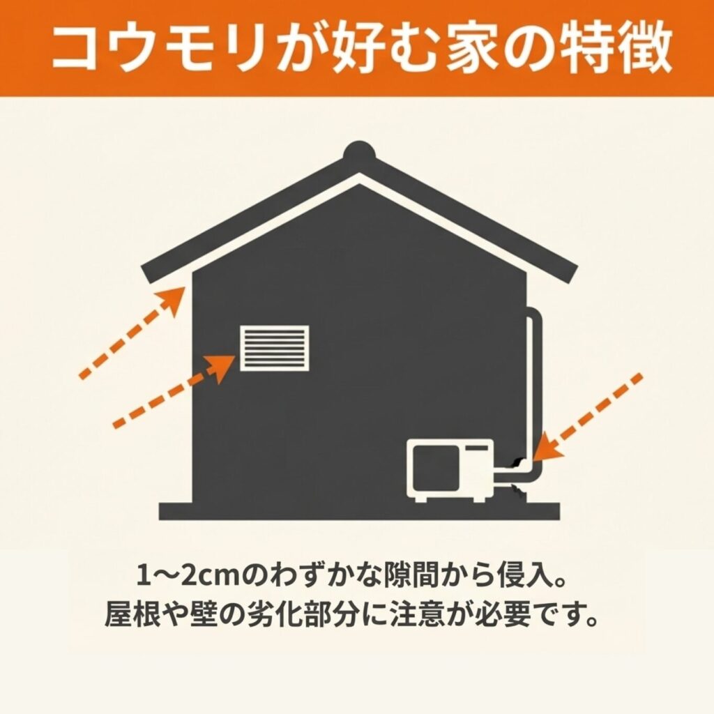 侵入経路の特定では、アブラコウモリが使う小さな隙間を見落としてしまうケースが多く見られます。