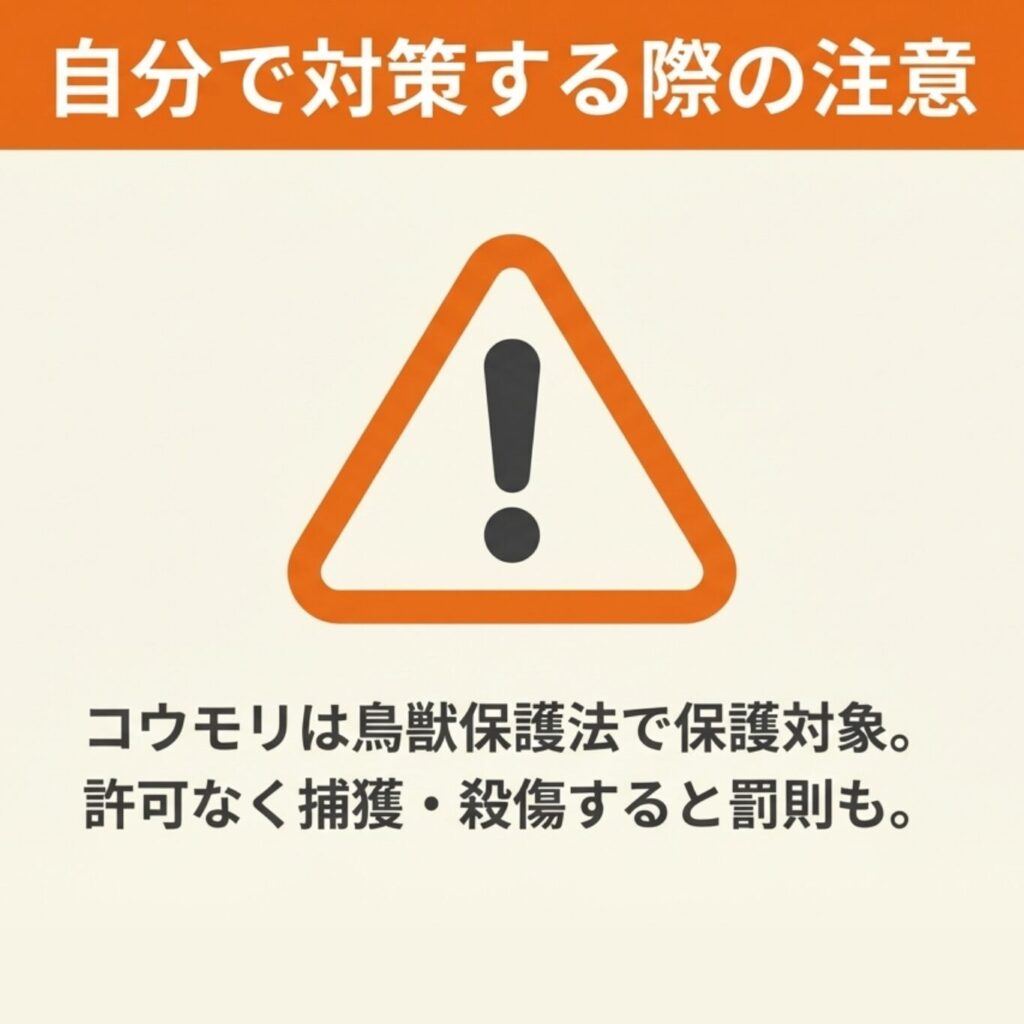 コウモリ対策を自力で行う際には、法的な制約や健康面でのリスクなど、事前に知っておくべき重要な注意点があります。