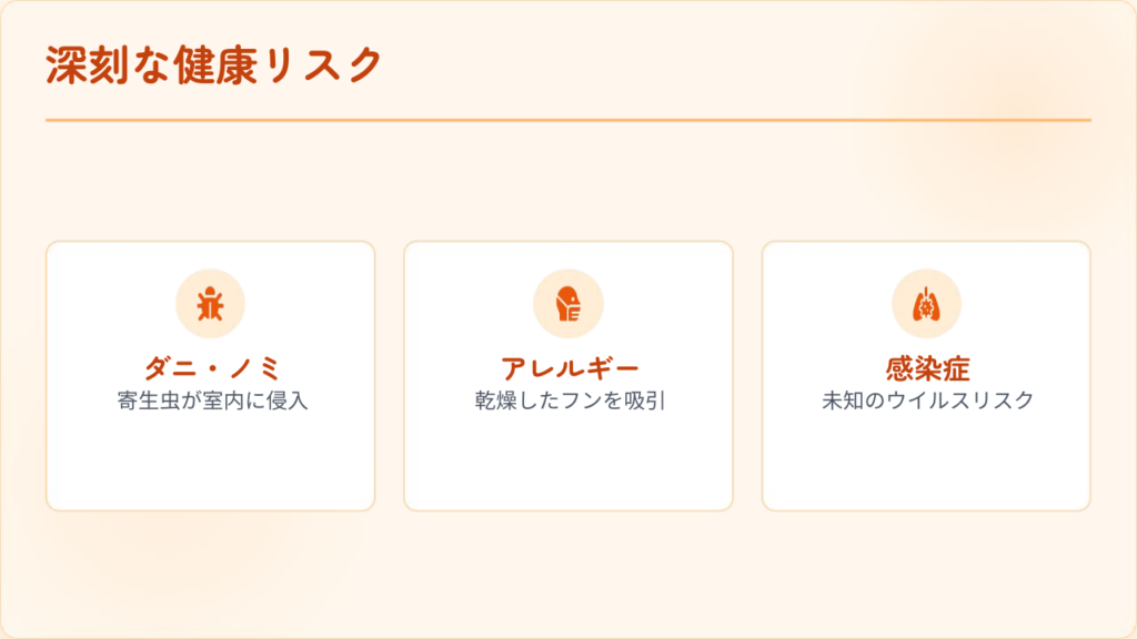 放置すれば糞尿による悪臭や住宅被害、健康リスクが増大するため、早めの対処が必要です。