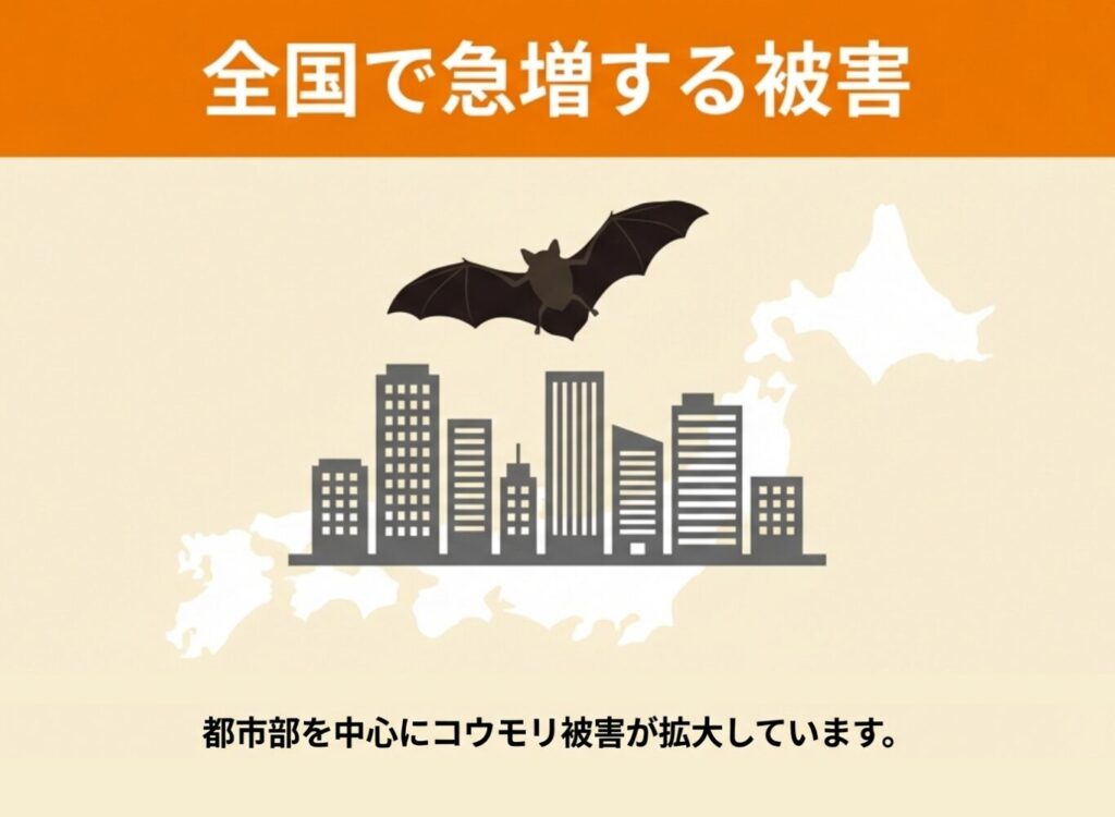 コウモリ被害は都市部を中心に全国で報告されており、特に関東や近畿の人口密集地では相談件数が増加傾向にあります。