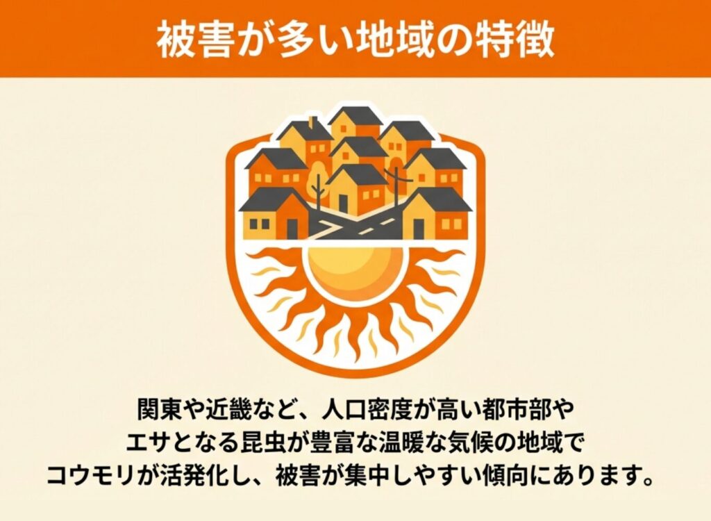 人口密度が高い都市部や温暖な気候の地域では、コウモリが活発に活動しやすい環境が整っているためです。