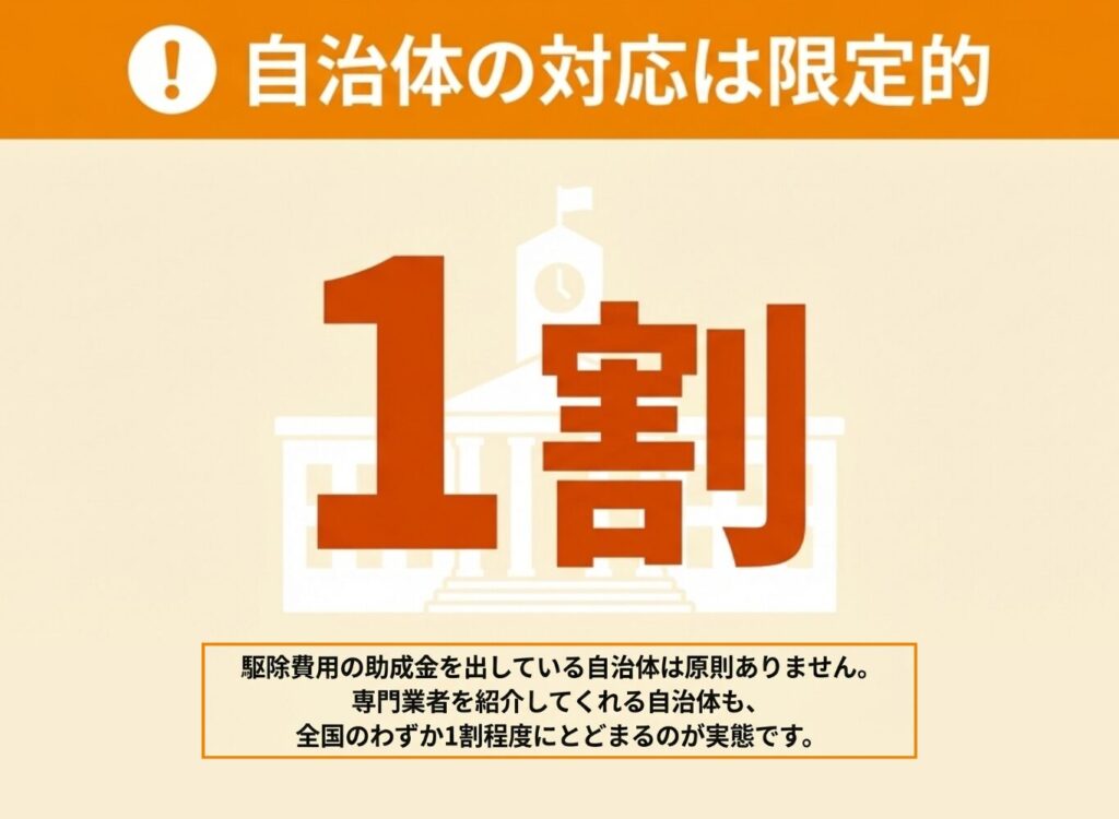 被害相談に対して専門の駆除業者を紹介してくれる自治体は、全体のわずか1割程度にとどまっています。