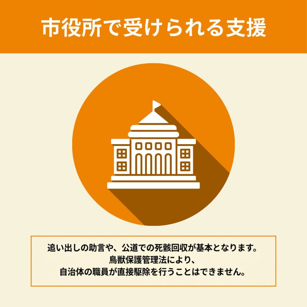 自治体に相談することで追い出し方法のアドバイスや業者紹介を受けられる場合がありますが、直接駆除を行ってもらうことはできません。