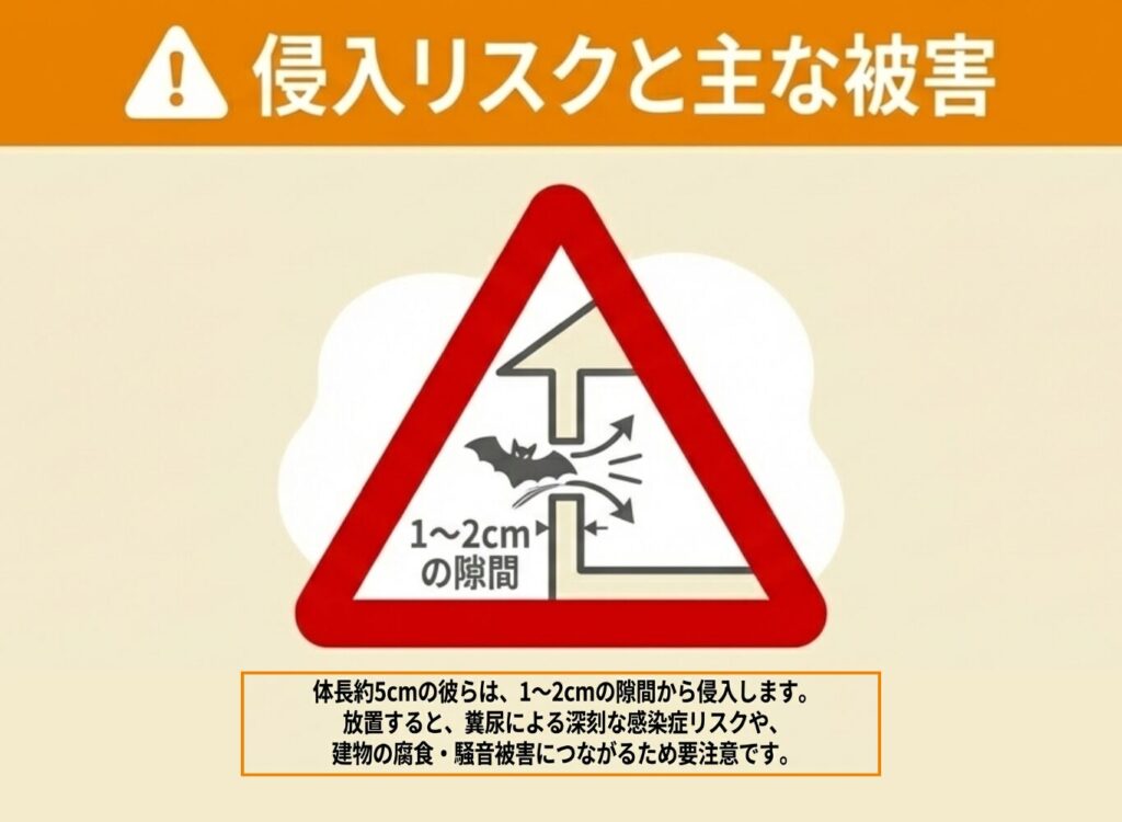 コウモリの糞尿がもたらす健康被害は、放置すると深刻なリスクに発展する可能性があります。