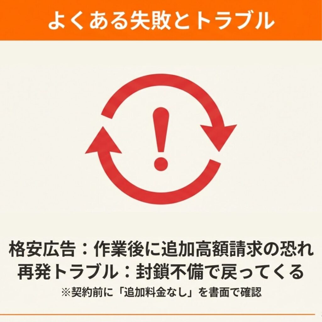 対策として、業者選びの際に再発保証の内容を確認し、万が一の場合に無償対応してもらえる契約を結ぶことが大切です。