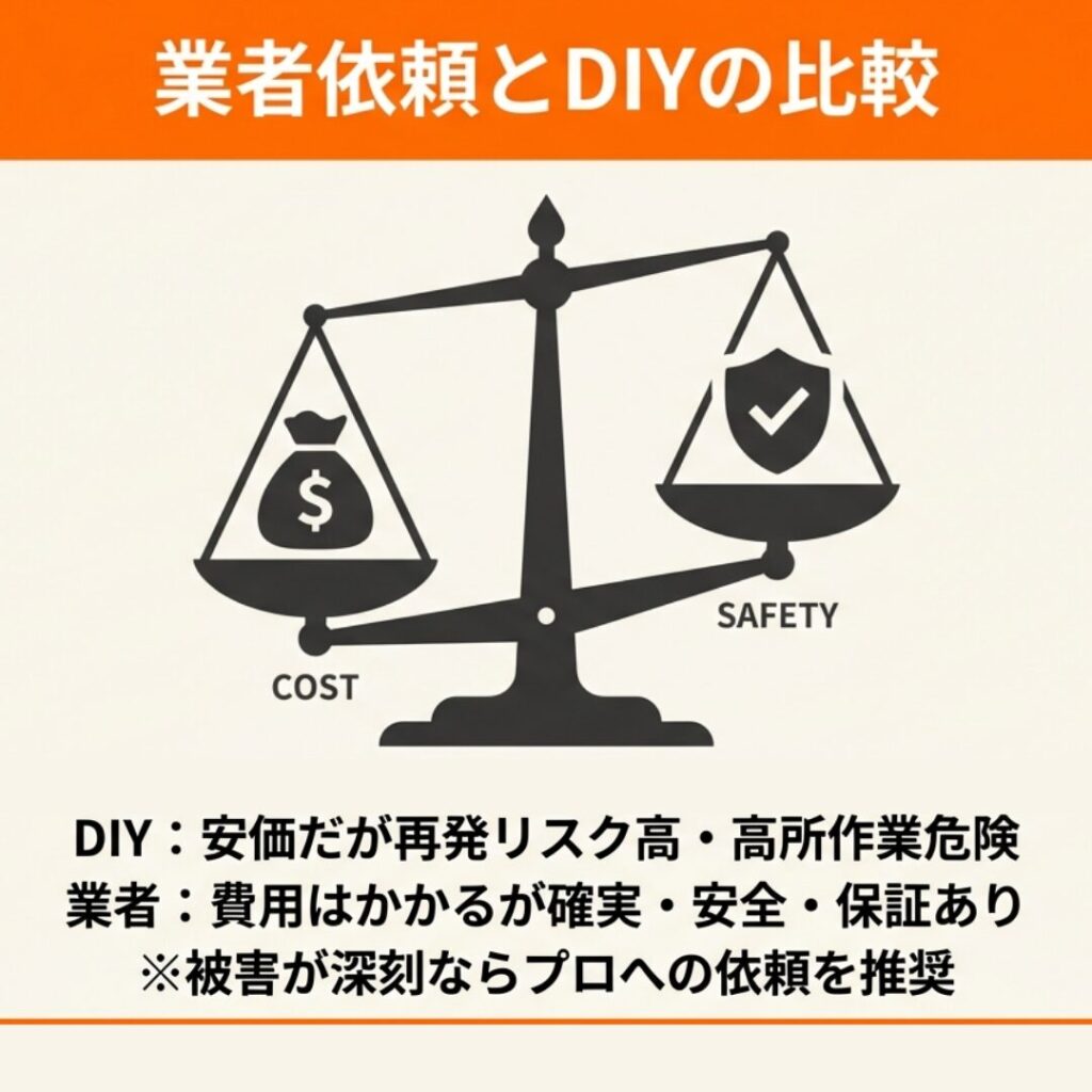 DIY駆除は初期費用が安い反面、再発リスクがあるため継続的な対策が必要です。
