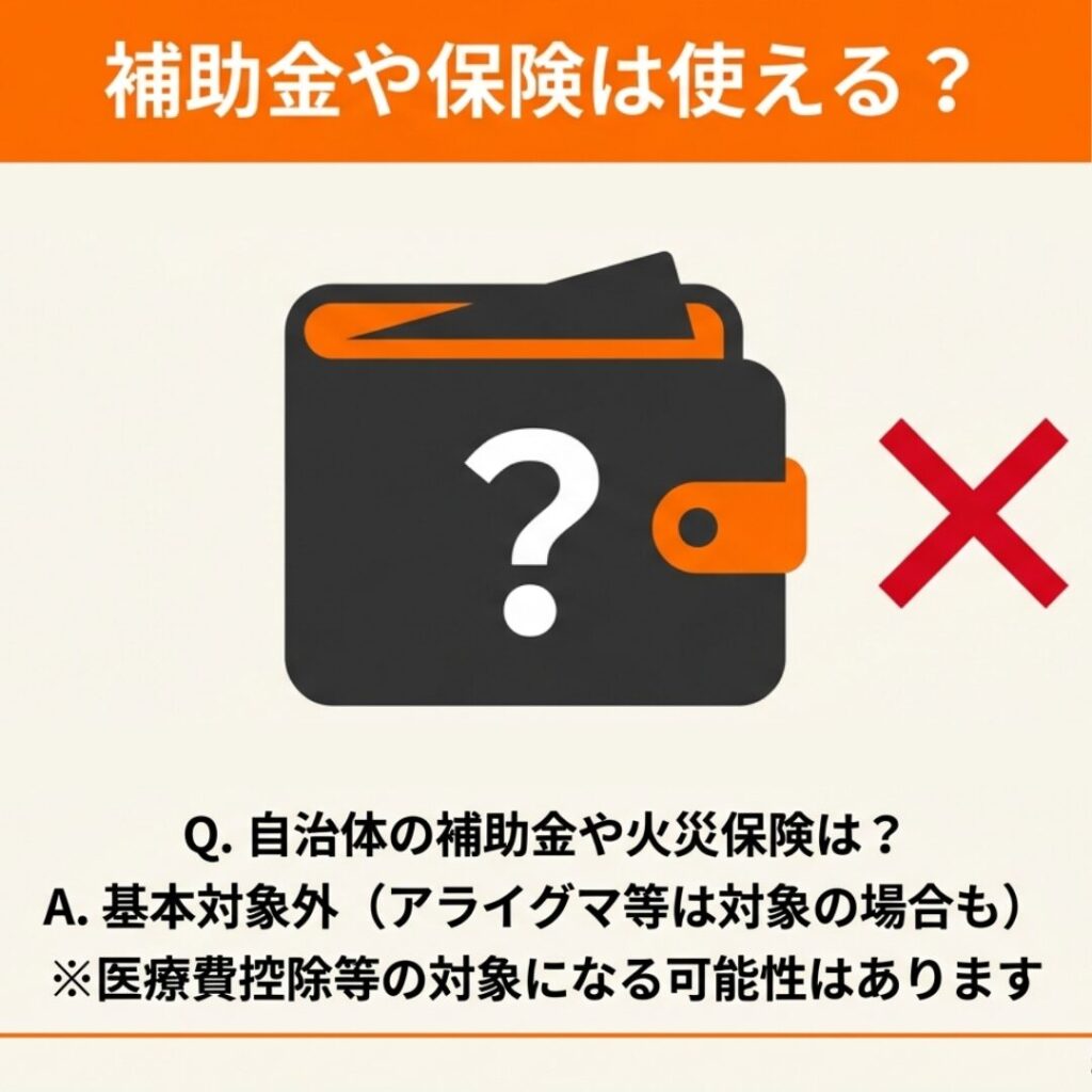 補助金や保険の適用は限定的なので、基本的には自己負担での対応を前提に計画を立てることをおすすめします。