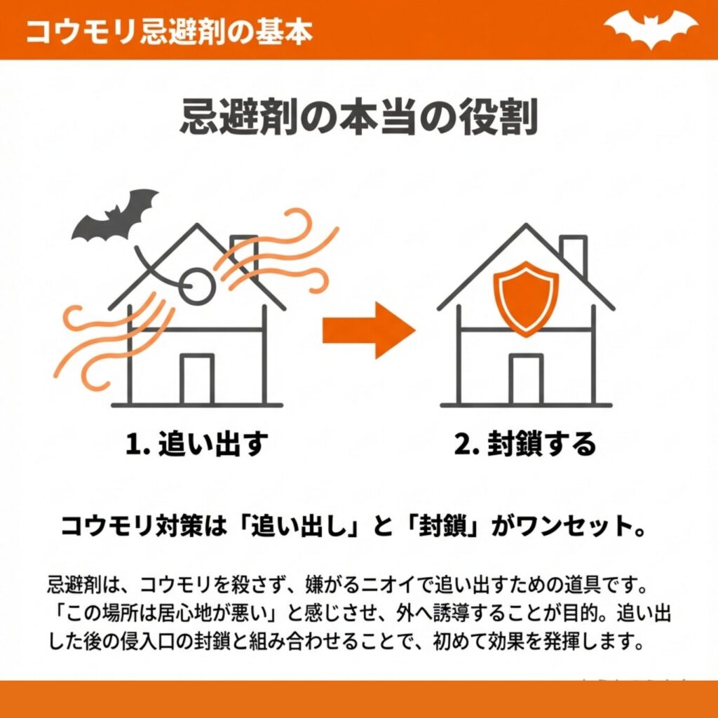 コウモリを殺すのではなく「近づかせない・居つかせない」ことが目的であり、追い出した後に侵入口をふさぐ作業とセットで使うのが基本となります。