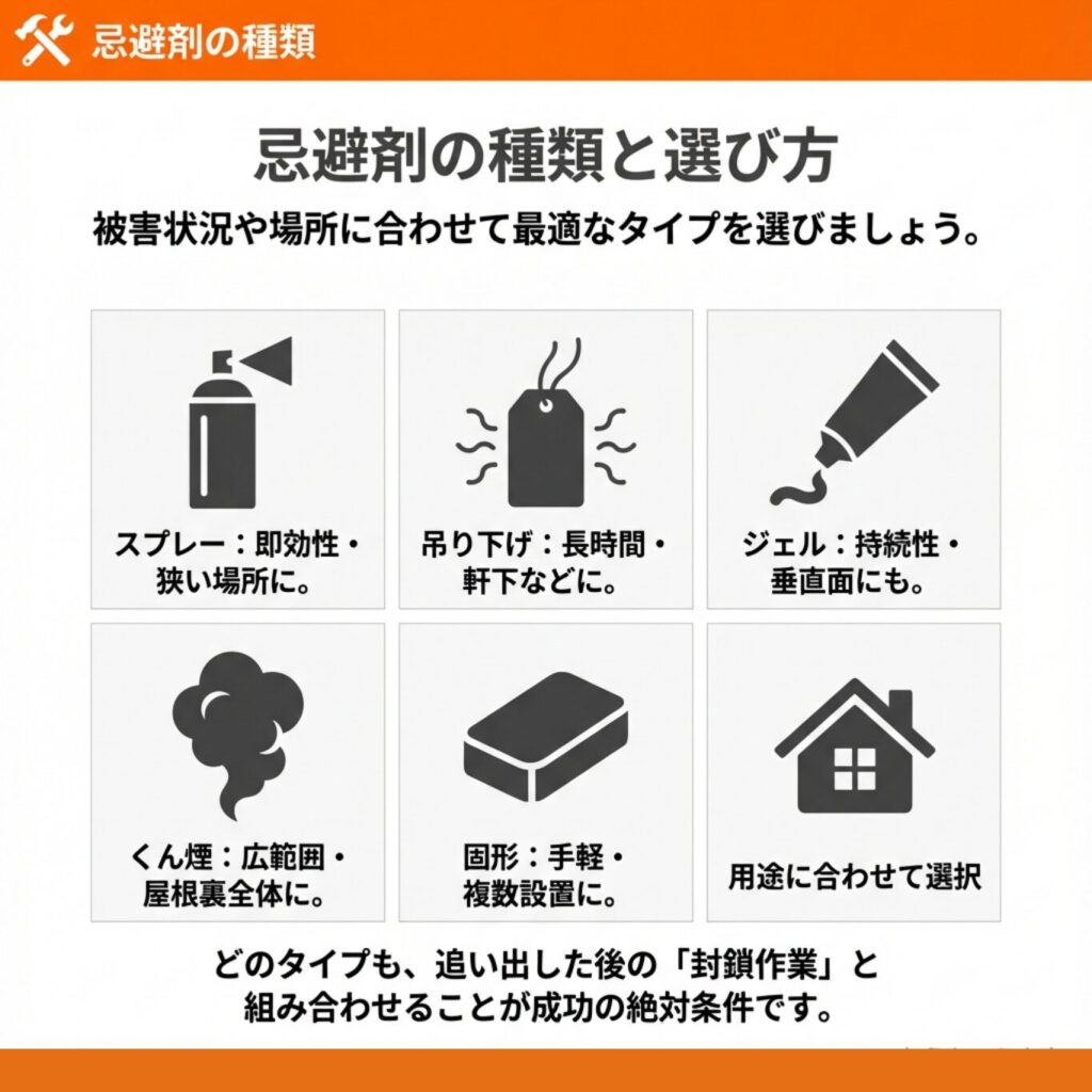 忌避剤は「追い出し」の道具として使い、必ず封鎖作業とセットで計画を立てましょう。
