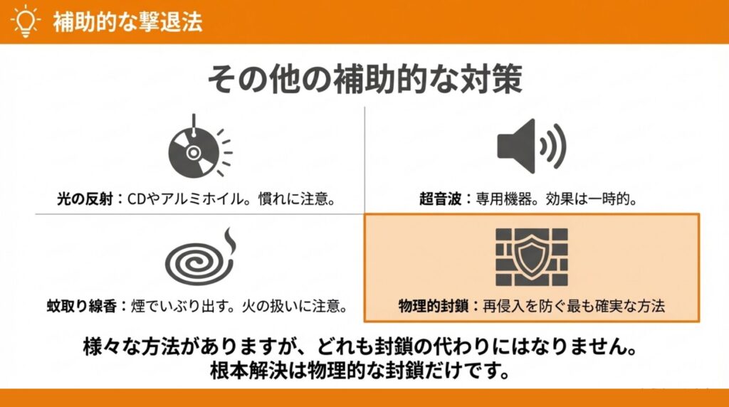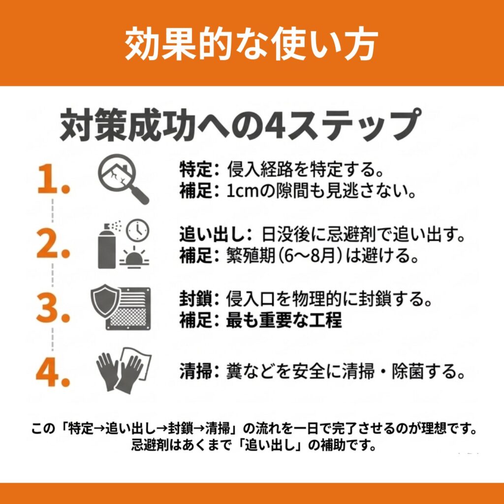 忌避剤だけでは再侵入を完全に阻止することは難しいため、封鎖・掃除・定期点検まで視野に入れた計画が欠かせません。