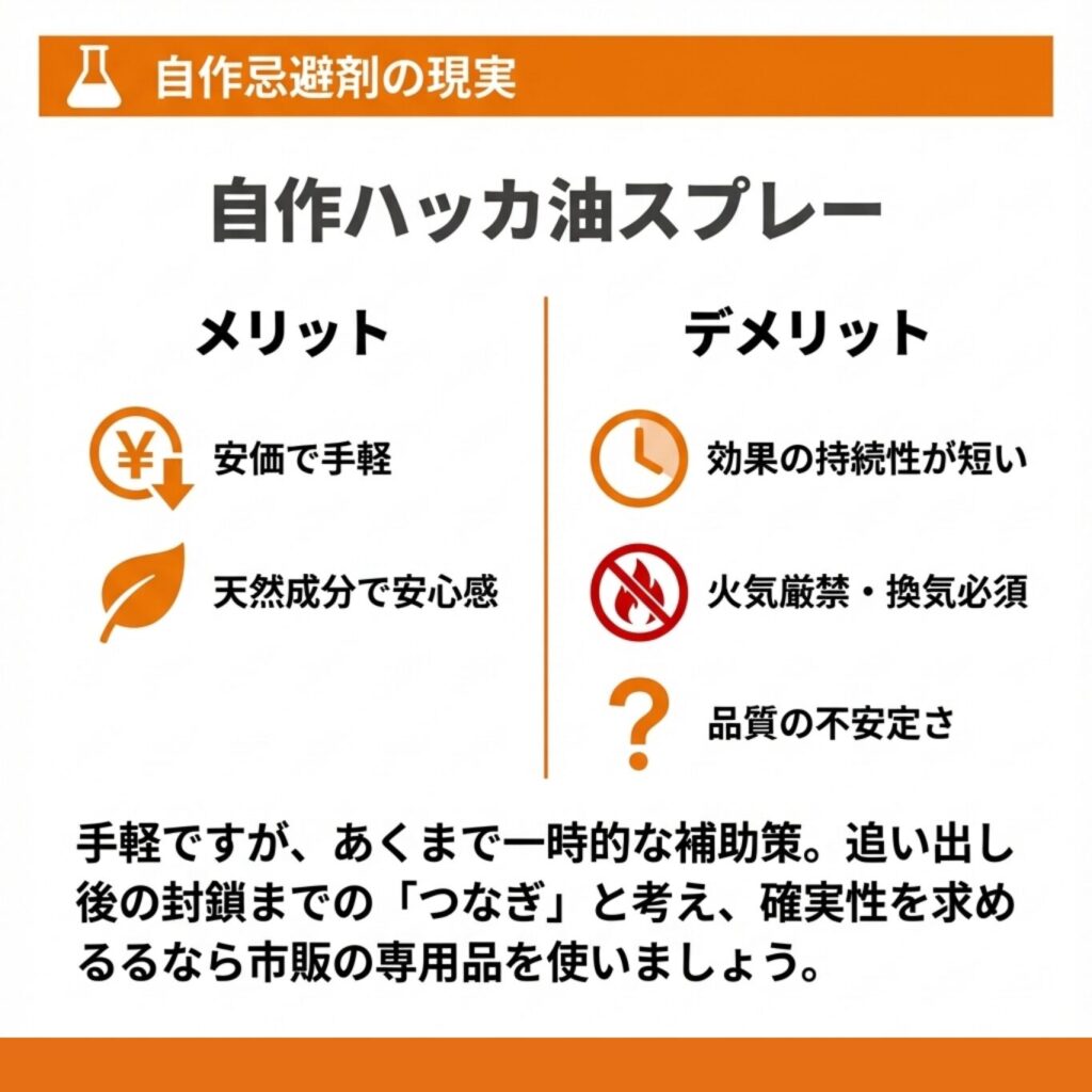 ハッカ油スプレーは短期間の追い出しには効果的ですが、長期の再侵入防止には物理的な封鎖が必須です。