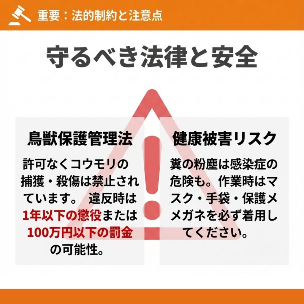 コウモリの捕獲や殺傷は鳥獣保護管理法で規制されており、無許可で行うと法律違反になる可能性があります。