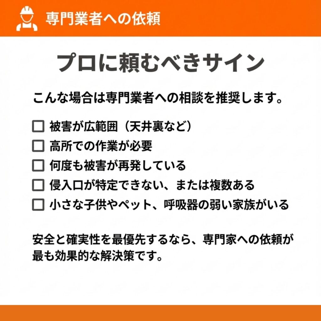 高所作業を伴う封鎖、屋根裏での広域除菌、自治体に相談しても改善しない繰り返し被害は、業者への依頼を検討すべきサインです。