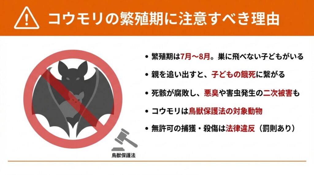 コウモリの繁殖期は、駆除作業で最も注意が必要な期間です。