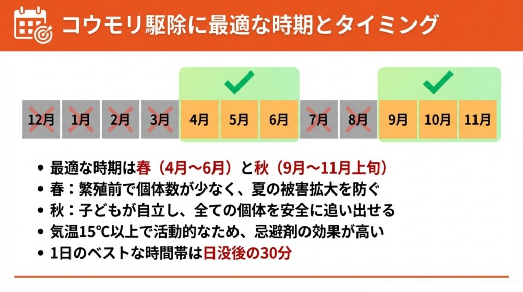 コウモリを効果的に駆除するには、適切な時期とタイミングの選択が重要です。