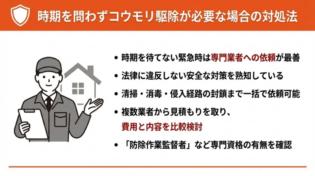 冬の駆除は春まで待つか、専門業者に相談するのが最善です。