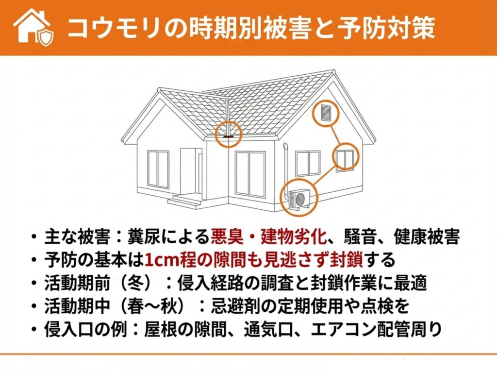 コウモリの時期別被害と予防対策