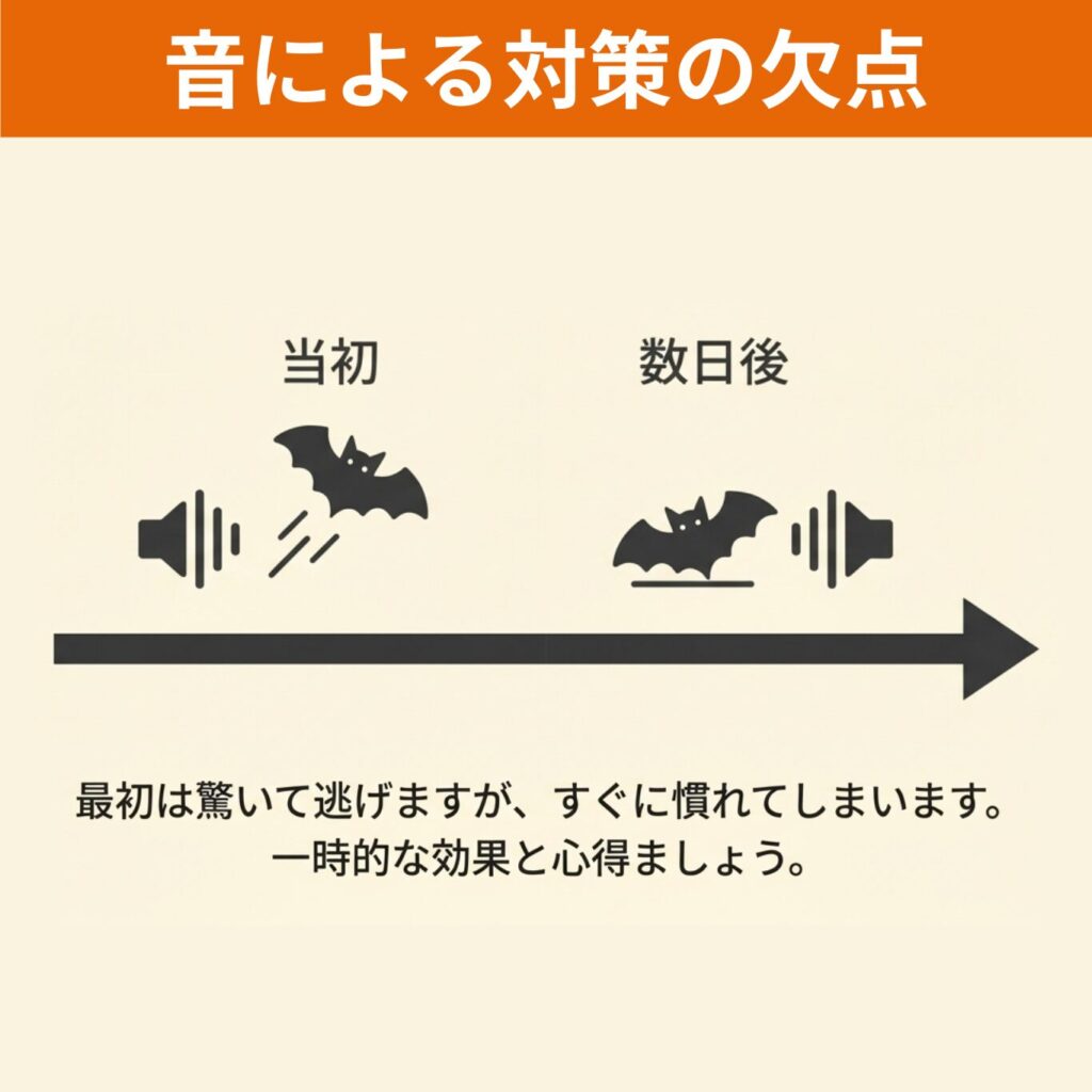音で一時的にコウモリを追い出せても、すぐに慣れてしまう可能性があります。過度な期待は禁物です。