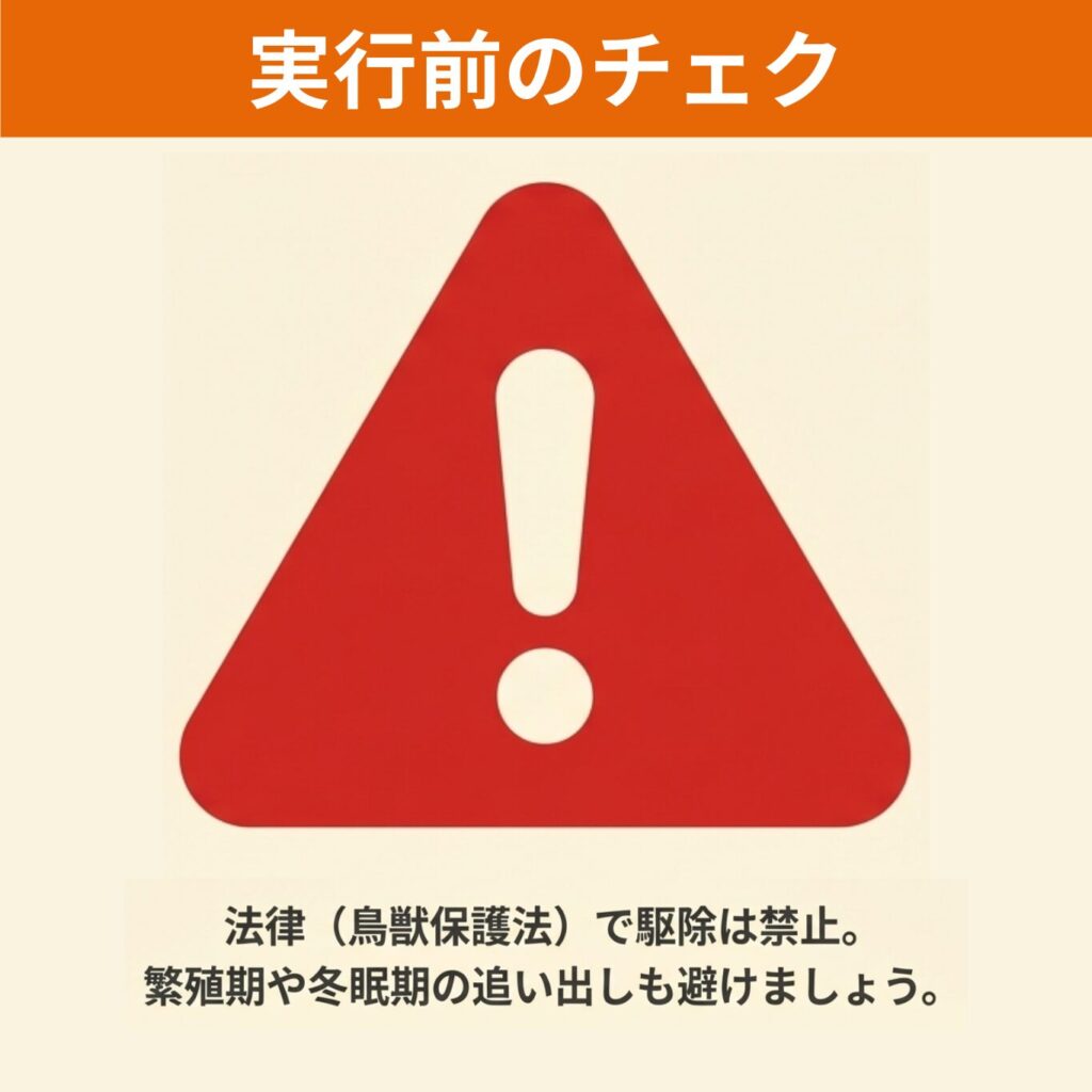 また、鳥獣保護管理法による法的制約や、実施時期の制限、人やペットへの影響など、気をつけるべき点も多くあります。