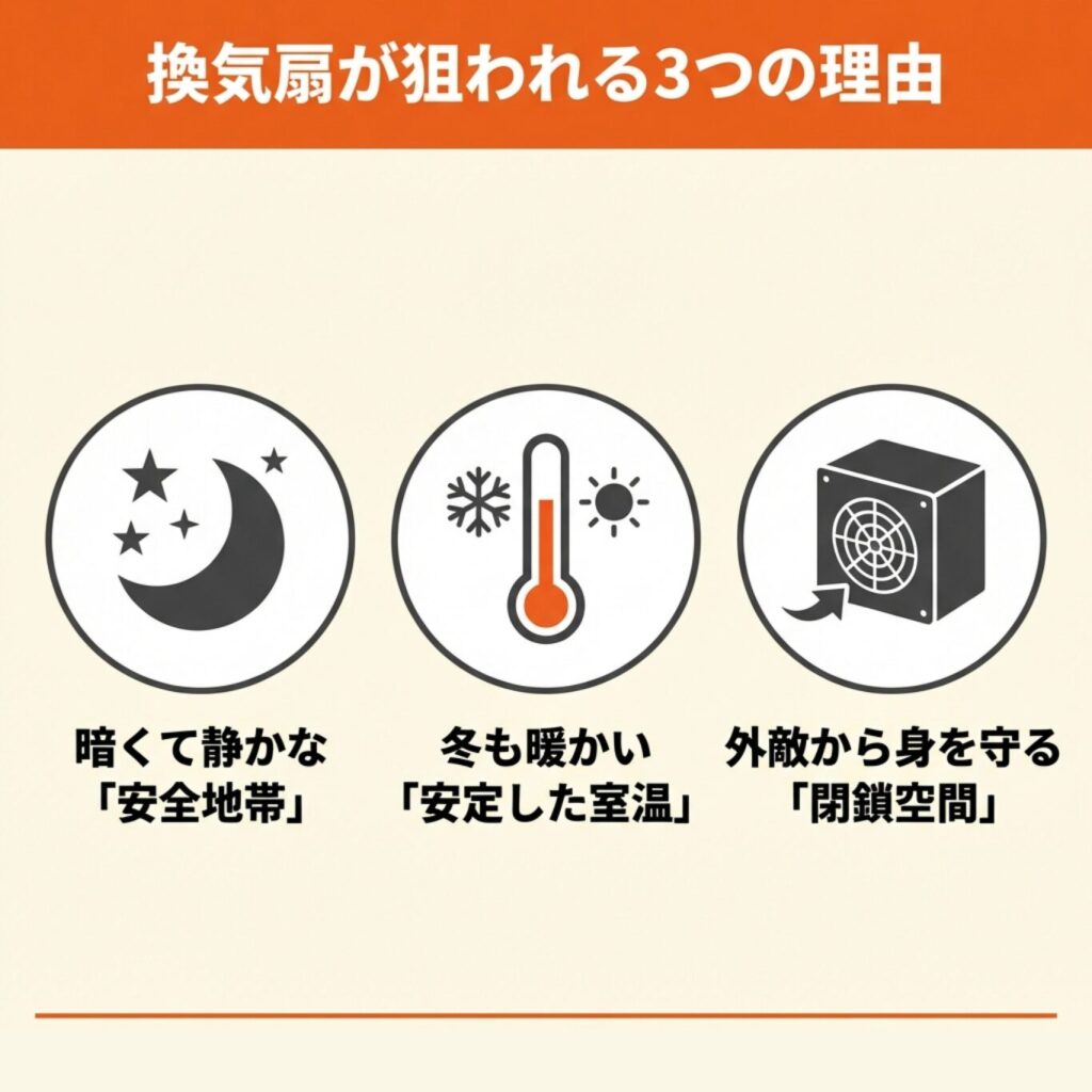 コウモリが換気扇に住み着く理由には、彼らの生態と換気設備の構造が深く関係しています。