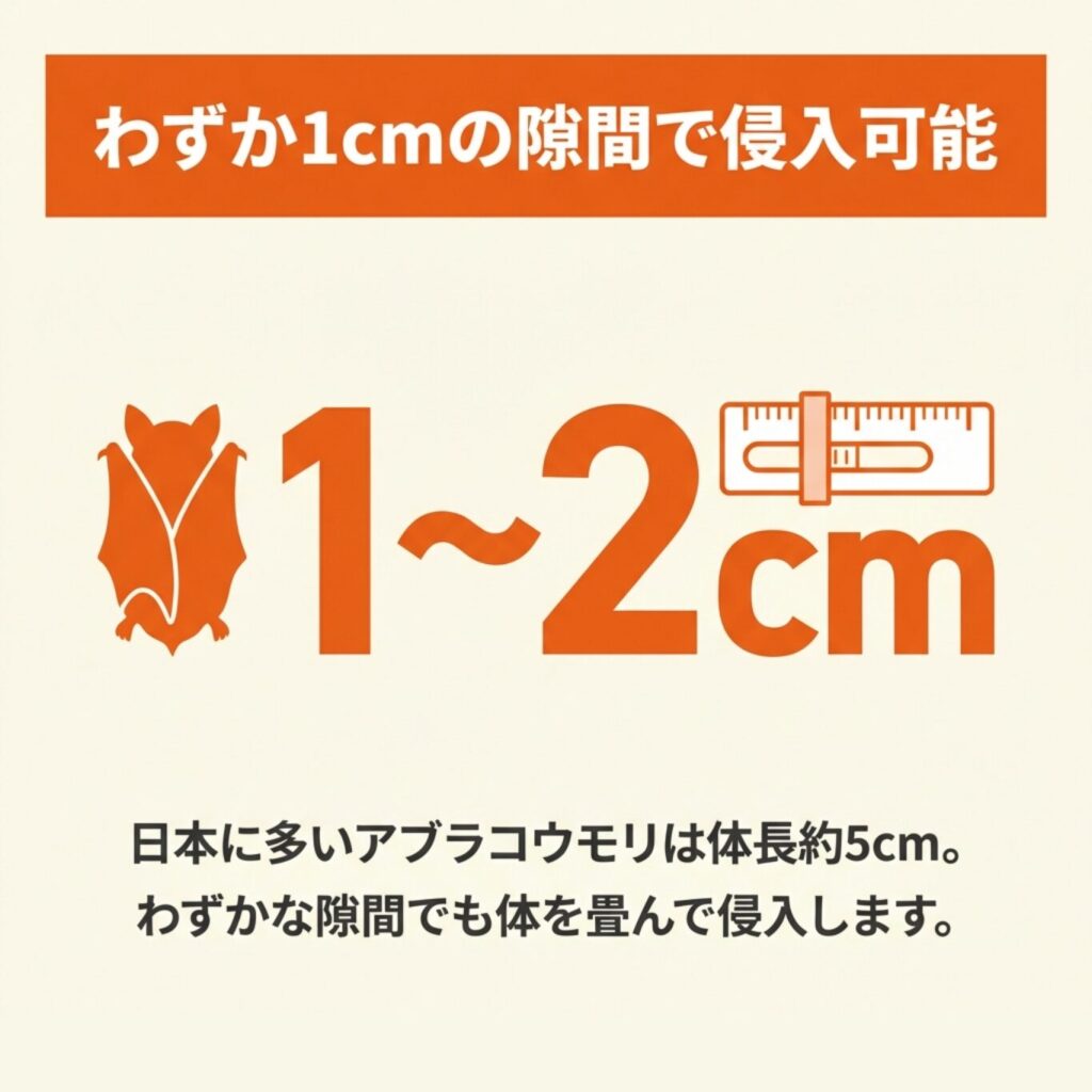 体長は約5cm、翼を広げても20cm程度と非常に小さく、1〜2cmほどの隙間があれば容易に侵入できます。