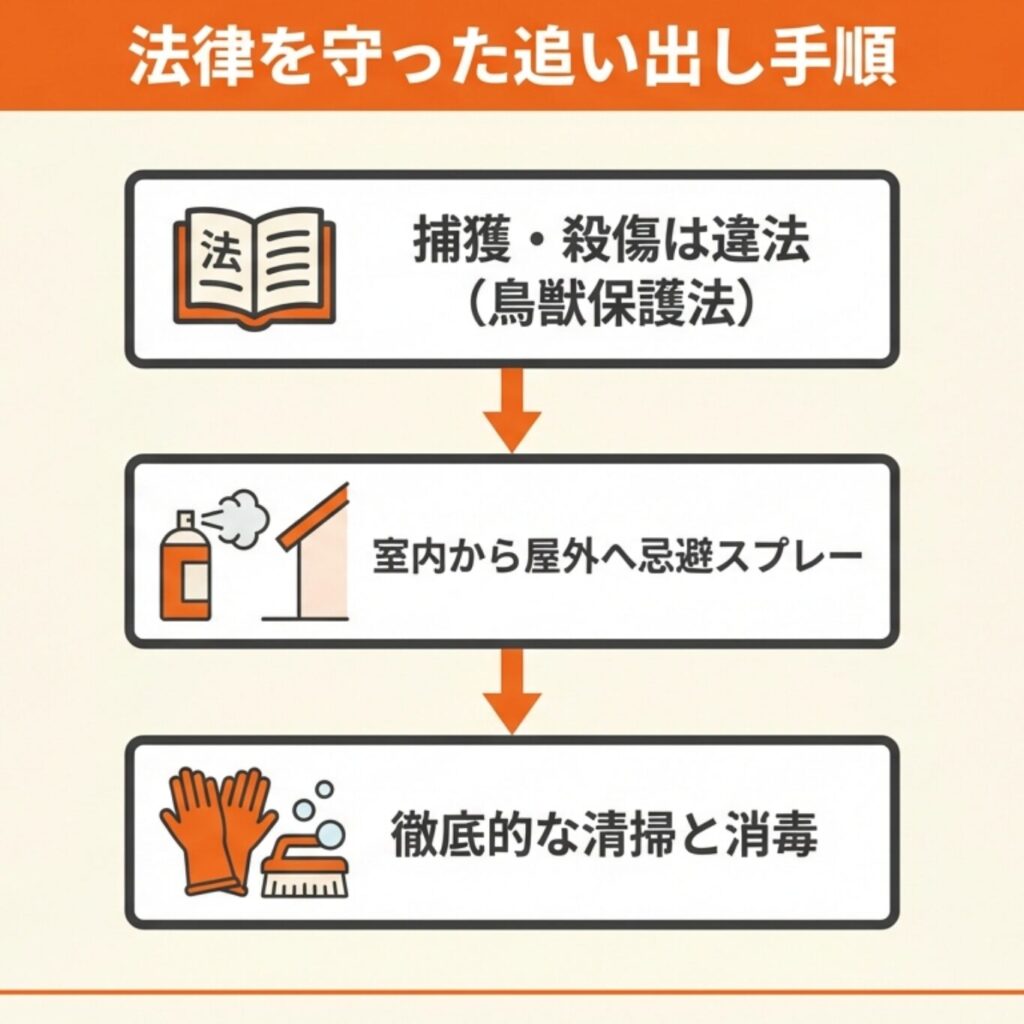 まず作業前に知っておくべき法律上の注意点を押さえ、適切な時期を選んだうえで、忌避スプレーを使った追い出しと清掃・消毒を実施しましょう。
