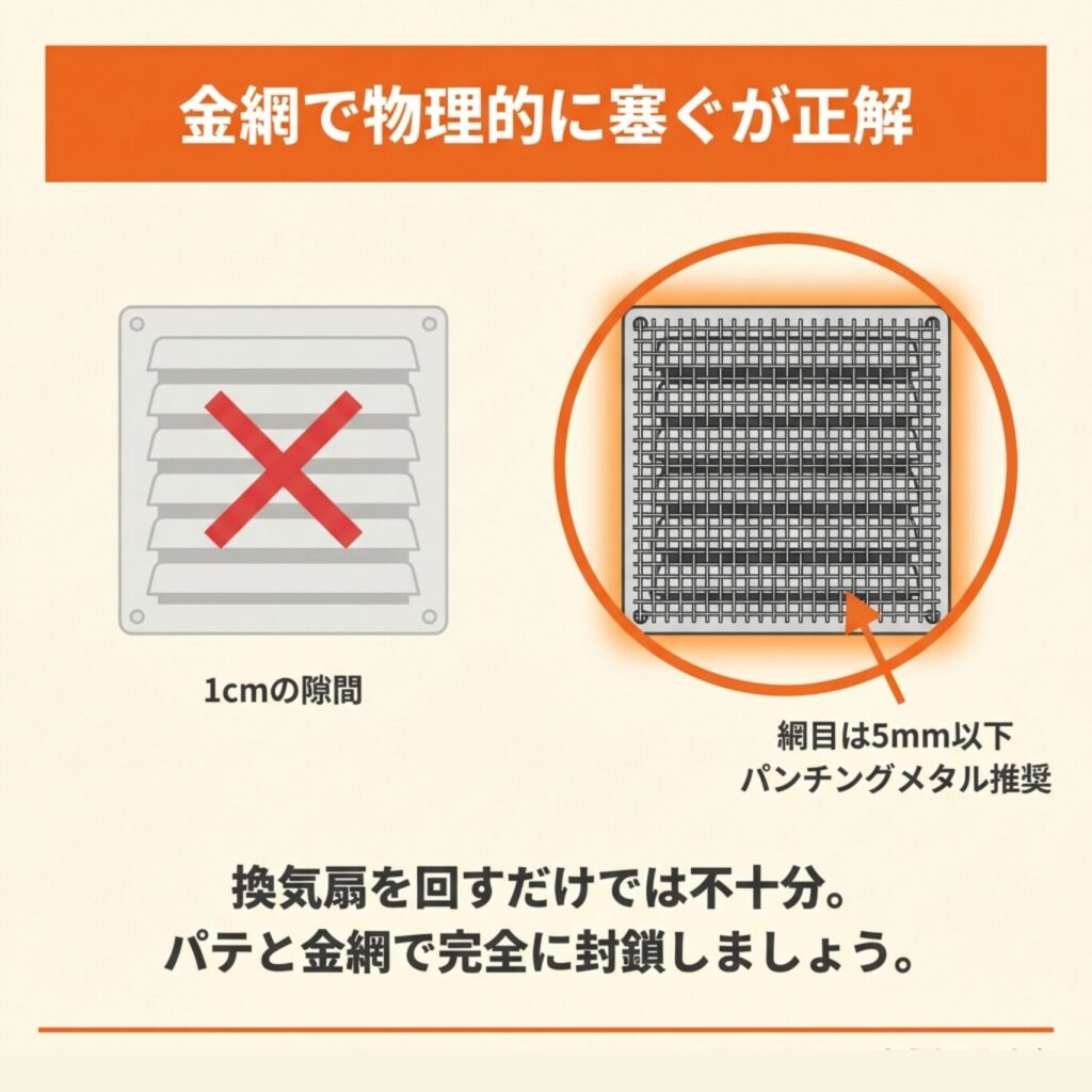 換気扇を停止したタイミングで侵入される可能性もあるため、金網やパンチングメタルで換気口を物理的に塞ぐ対策と併用することが重要です。