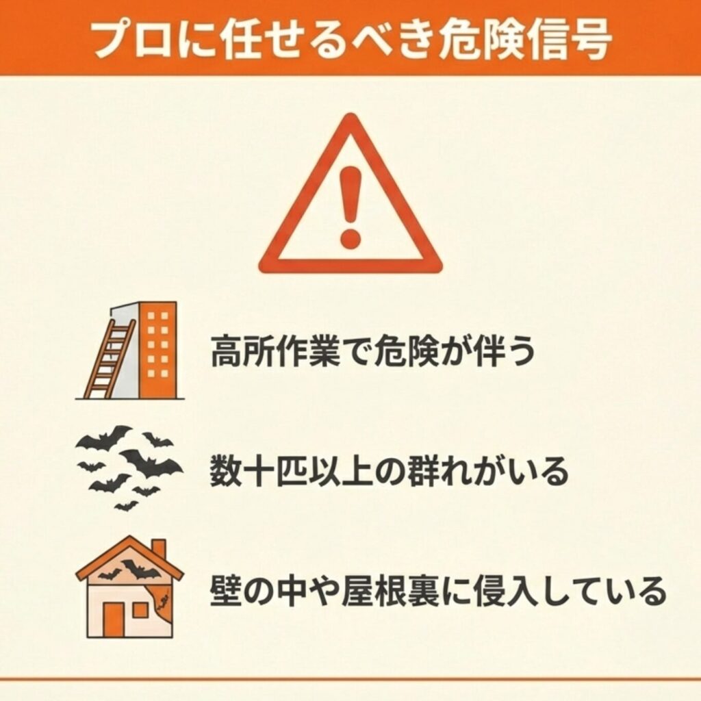 自力でのコウモリ対策が難しいと判断すべきケースとして、まず複数匹が群れで住み着いている場合が挙げられます。